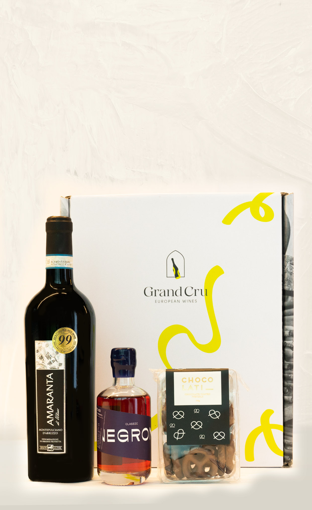 For lovers of fine Italian Red wine, a gift pack that is sure to impress. A bottle of the full flavoured Tenuta Ulisse Amaranta Montepulciano d’Abbruzzo Red Wine, a selected bottle of hand crafted Batch & Co Cocktail* ready to drink, or Isole e Olena Olive Oil, and exclusive Chocolati Milk Chocolate coated chocolates, gifts to enjoy and savour.